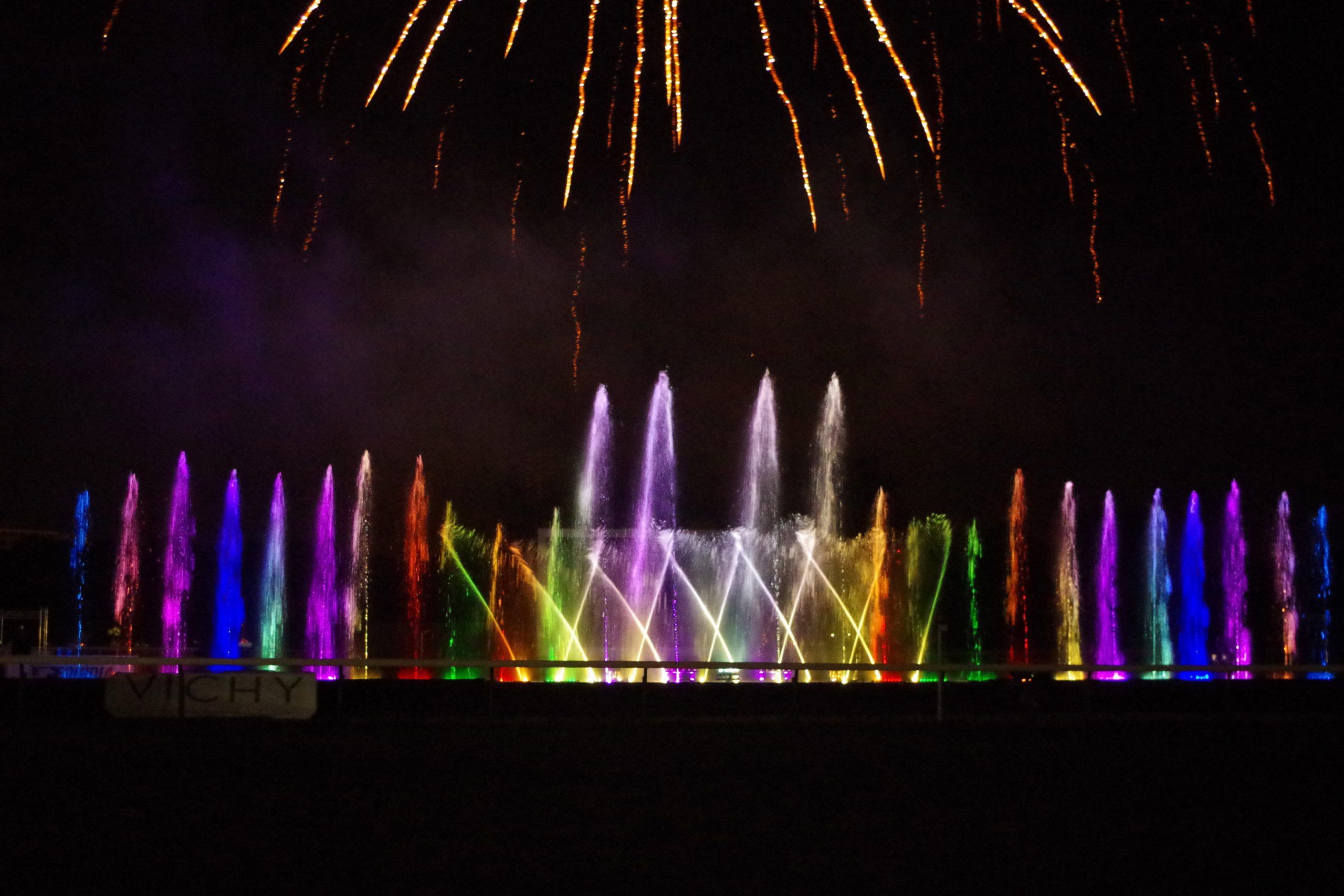 Europe Évènement - Flames photo with purple water jets behind